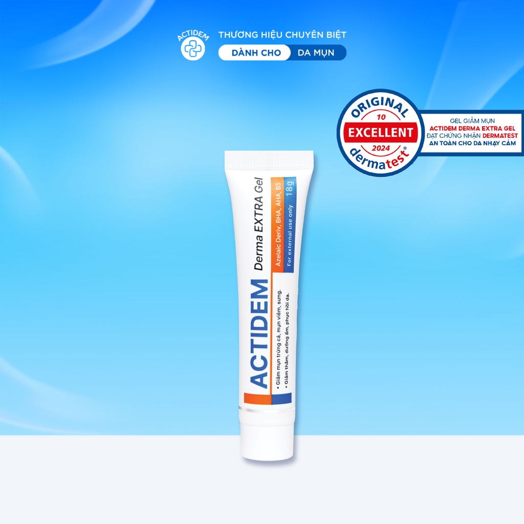 Gel Giảm Mụn Mờ Thâm Actidem Derma Extra Gel là dòng dược mỹ phẩm dành cho da mụn với bộ 3 “hoạt chất vàng” hỗ trợ tối ưu trong quá trình “tạm biệt” thâm sau mụn, thâm đỏ là Azelaic Deriv - AHA - Niacinamide. Bên cạnh đó, sản phẩm còn được bổ sung Vitamin B3 - B5 - HA hỗ trợ làm lành vết thương, ngừa kích ứng hiệu quả.