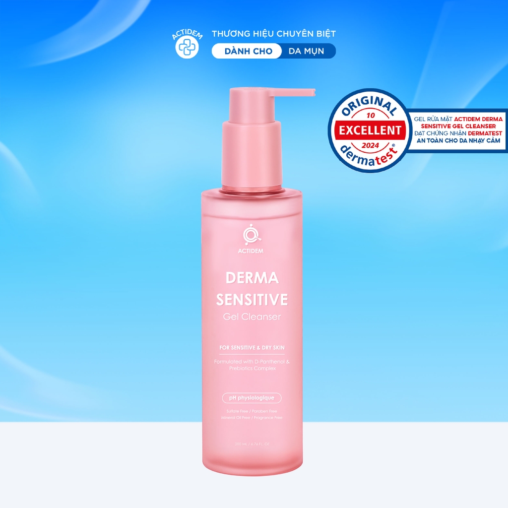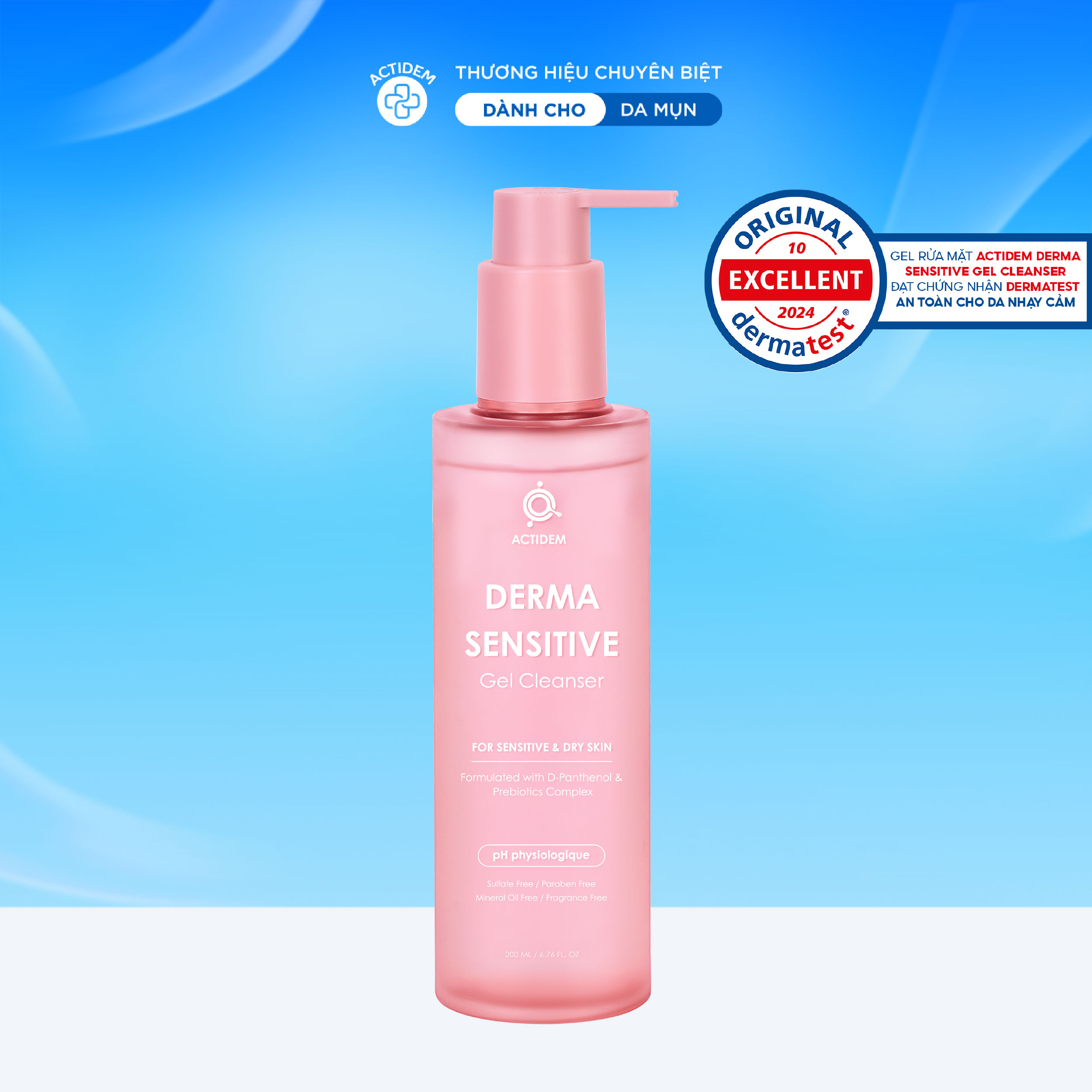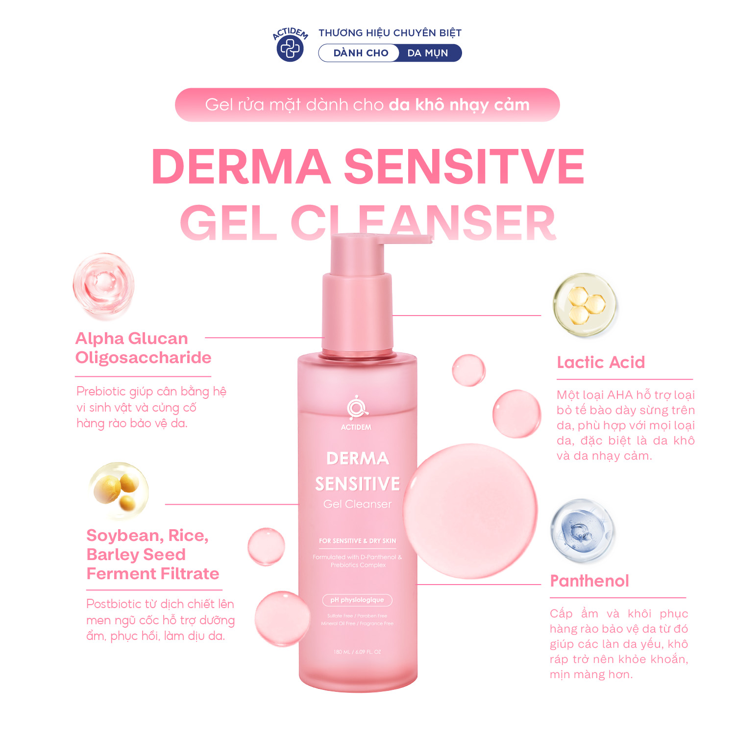 Gel rửa mặt tối ưu hệ vi sinh dành riêng da khô có mụn đặc biệt dùng được cho da nhạy cảm Actidem Derma Sensitive Gel Cleanser là một sản phẩm chăm sóc da chuyên biệt, được nghiên cứu và phát triển để đáp ứng nhu cầu làm sạch hiệu quả đồng thời hạn chế các vấn đề kích ứng của da. Actidem Derma Sensitive Cleanser với bảng thành phần ưu việt gồm Alpha Glucan Oligosaccharide - một loại Prebiotic và Postbiotic từ dịch chiết lên men ngũ cốc giúp hỗ trợ hệ vi sinh vật trên da khỏe mạnh, làm dịu da và ngăn ngừa các tác nhân gây mụn. Sản phẩm phù hợp mọi loại da, đặc biệt là da nhạy cảm và da khô, đã được kiểm nghiệm Dermatest - "AN TOÀN CHO DA NHẠY CẢM" bởi GmbH từ Đức.